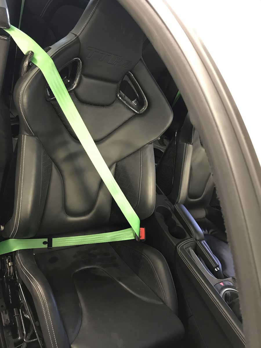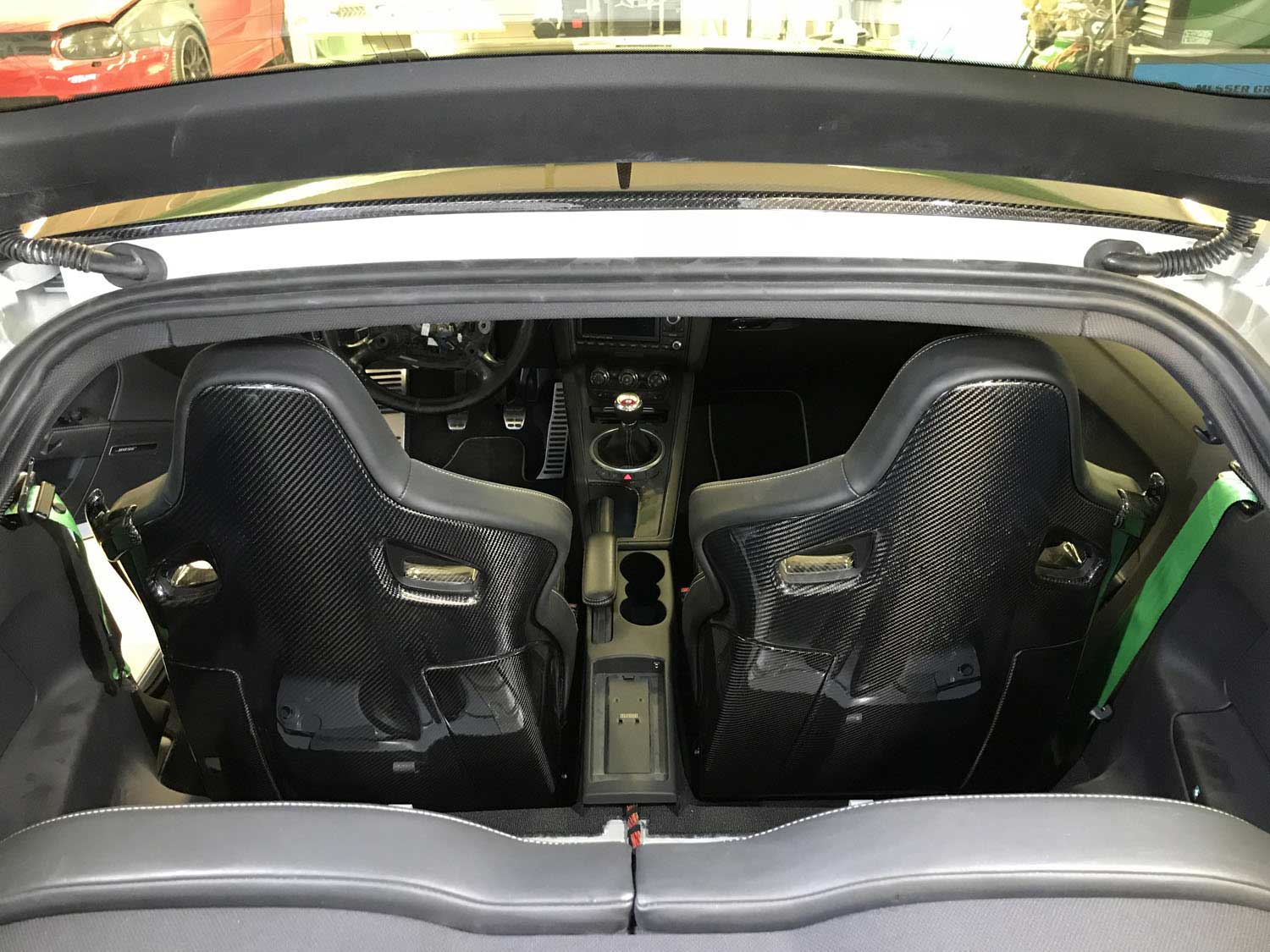 | Innenraum | Die Recaro Sportster CS wurden von uns zerlegt und die Rückenschalen haben wir mit Carbon beschichtet. Die Sicherheitsgurte wurden gegen Grüne getauscht. |
