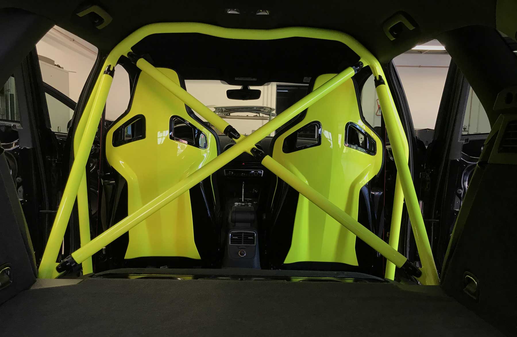 | Innenraum | Hier haben wir einen Clubsport Bügel und Recaro Sportster CS verbaut. Der Bügel wie auch die Sitz Rückenschalen und die Lüftungsdüsen haben wir in NEON-Gelb Lackiert. Die Sitze, das Lenkrad, die Mittelkonsole, und die Armauflagen wurden neu mit Leder bezogen und mit einem NEON Gelben Faden abgesetzt. |