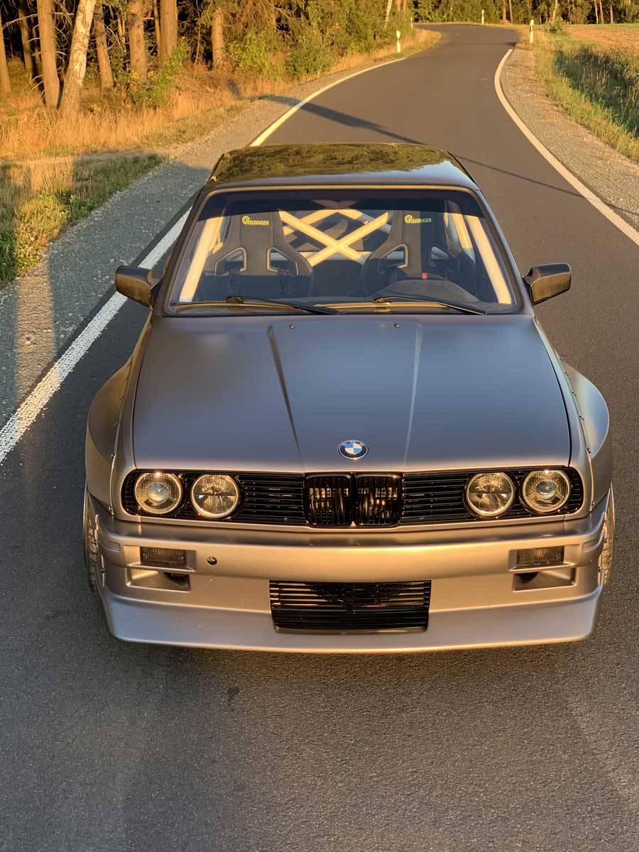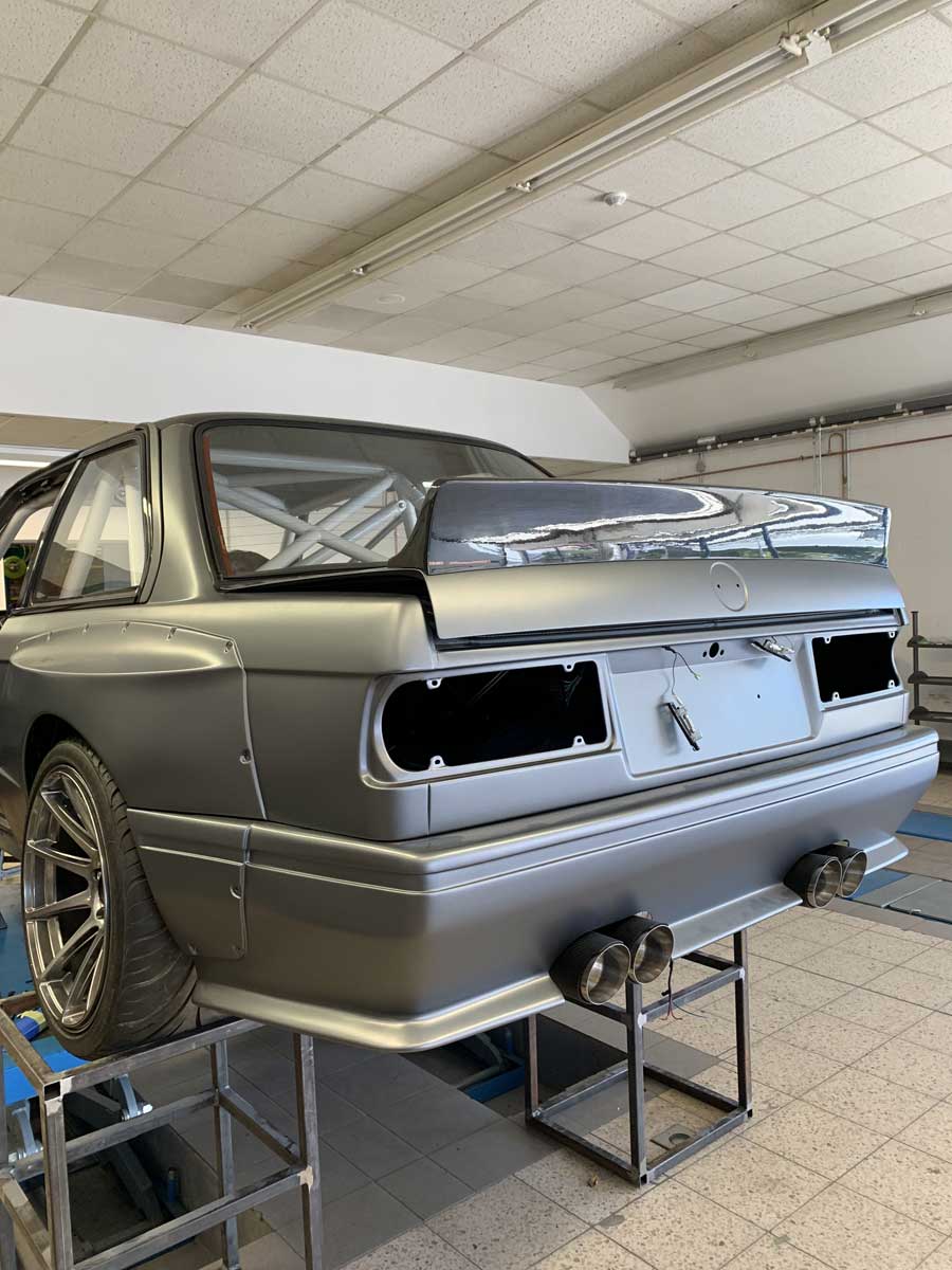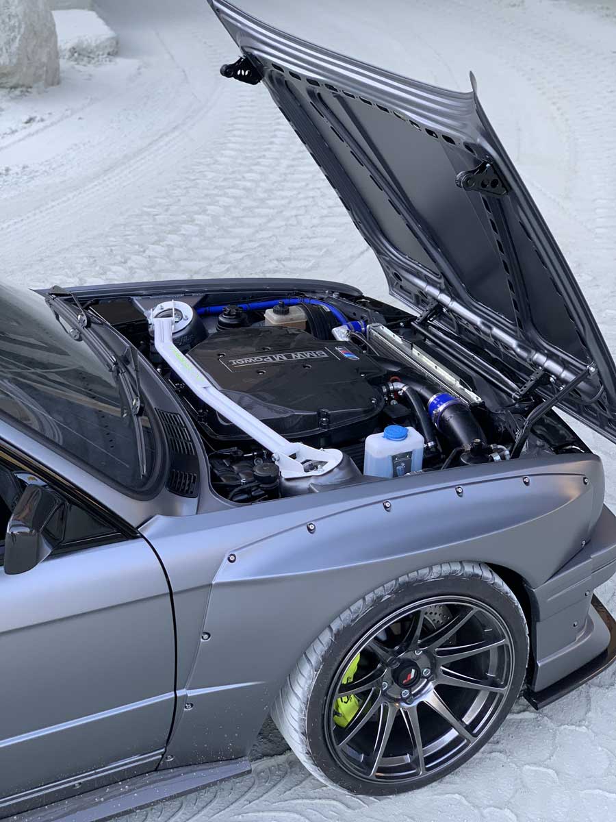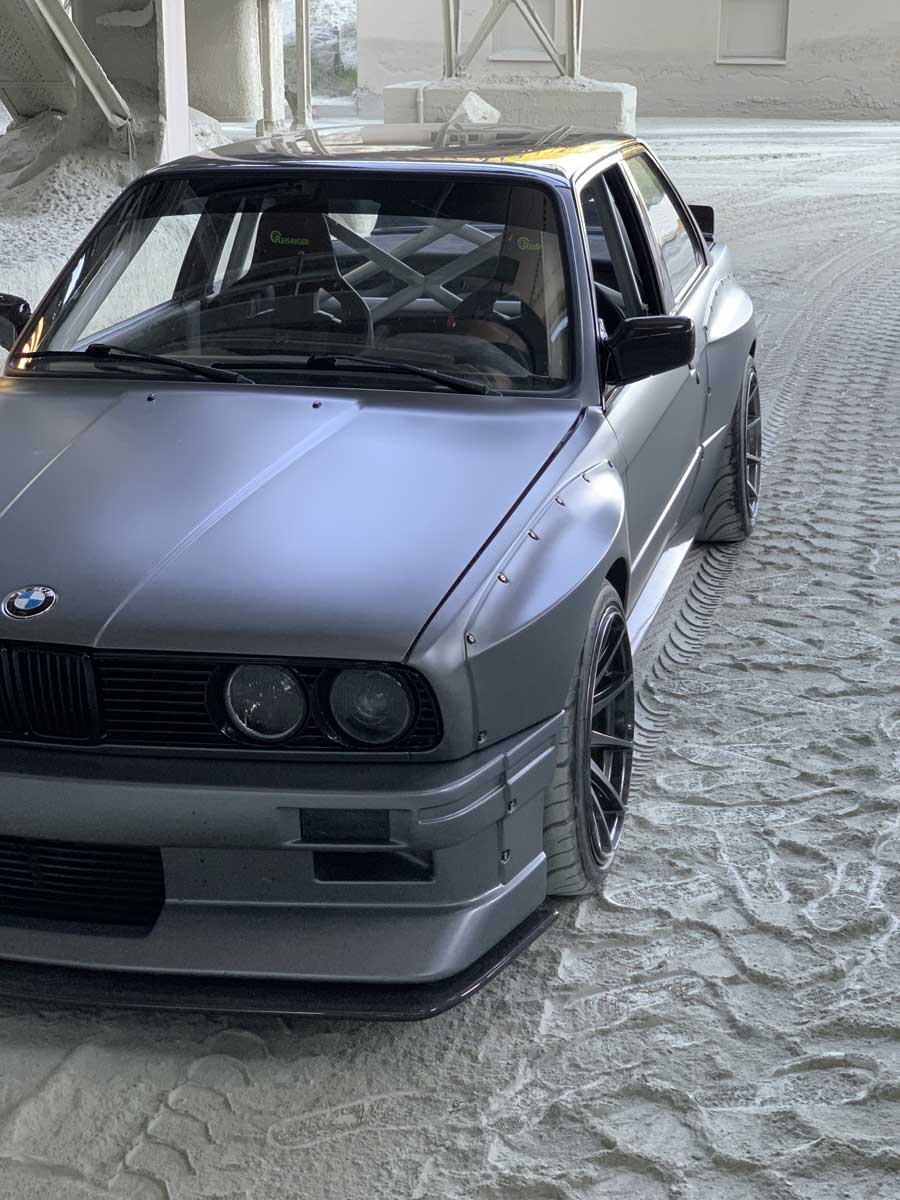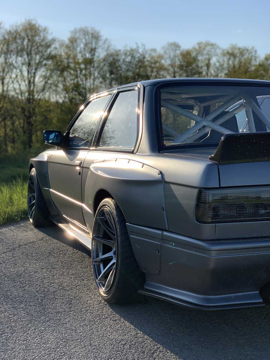 | Bodykit | Hier haben wir ein Widebodykit verbaut. Wie auch M3 E30 EVO Stoßstangen, diese wurden dann auch noch von uns auf die Verbreiterungen abgeändert, wie auch in der höhe angepasst. Die Carbon Seitenschweller wie auch die umlaufenden Carbon Spoiler Lippen haben wir extra für das Fahrzeug angepasst. Ein Carbondach wurde von uns ebenfalls für das Fahrzeug angefertigt. |