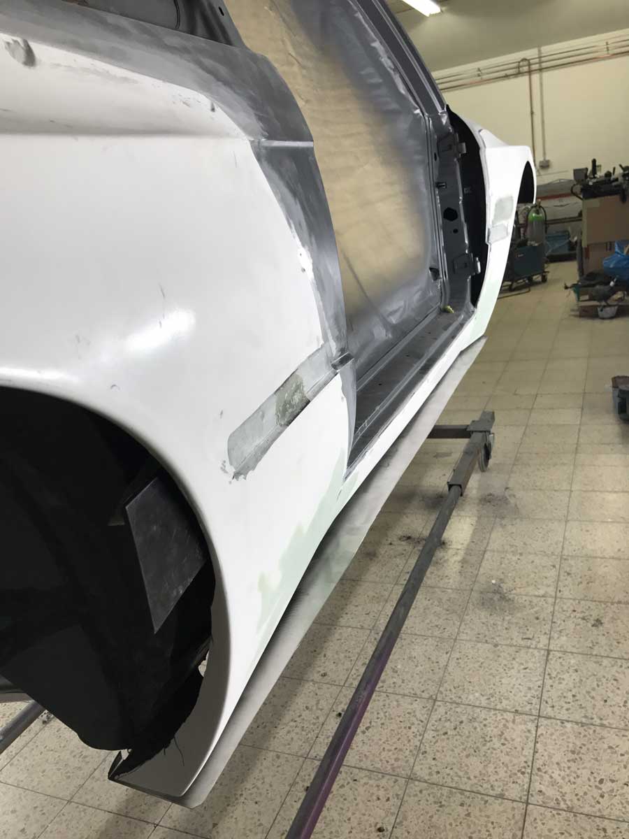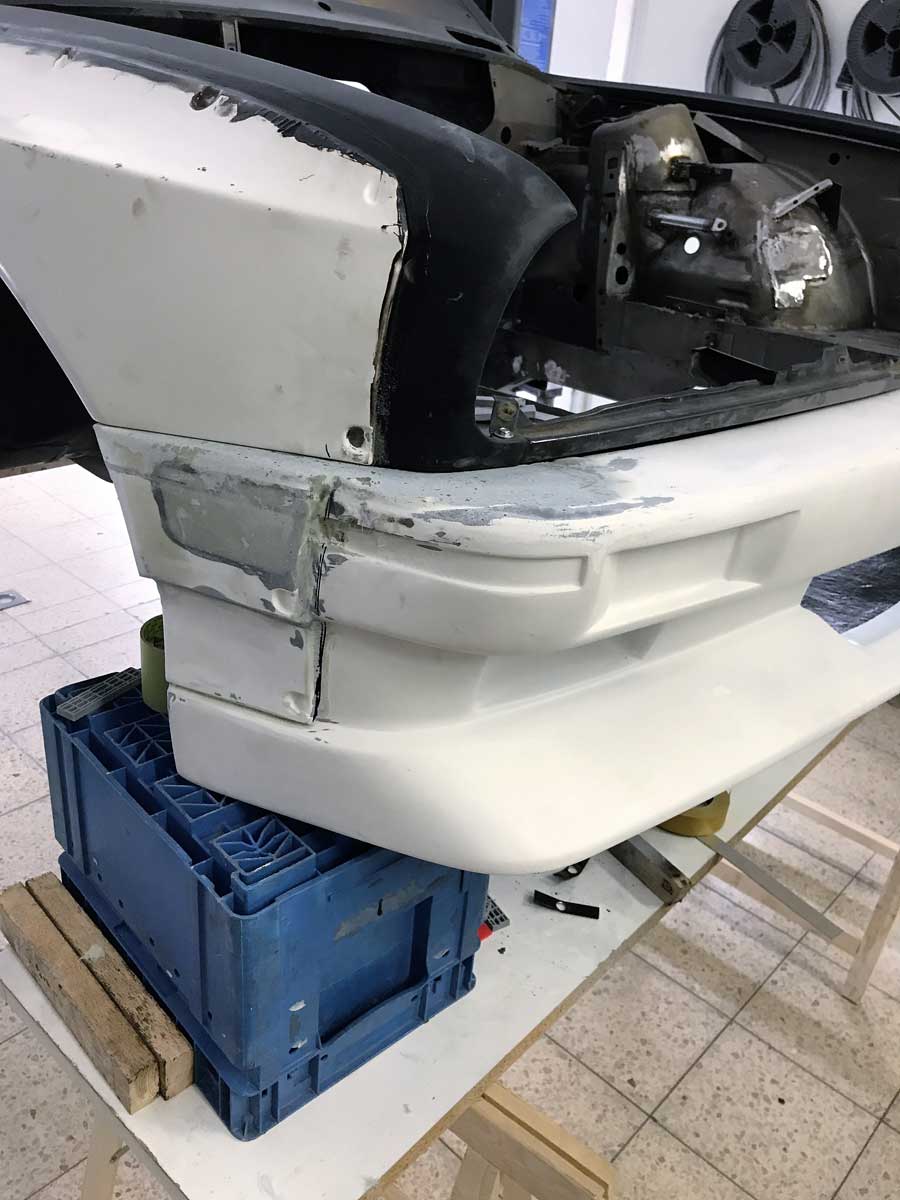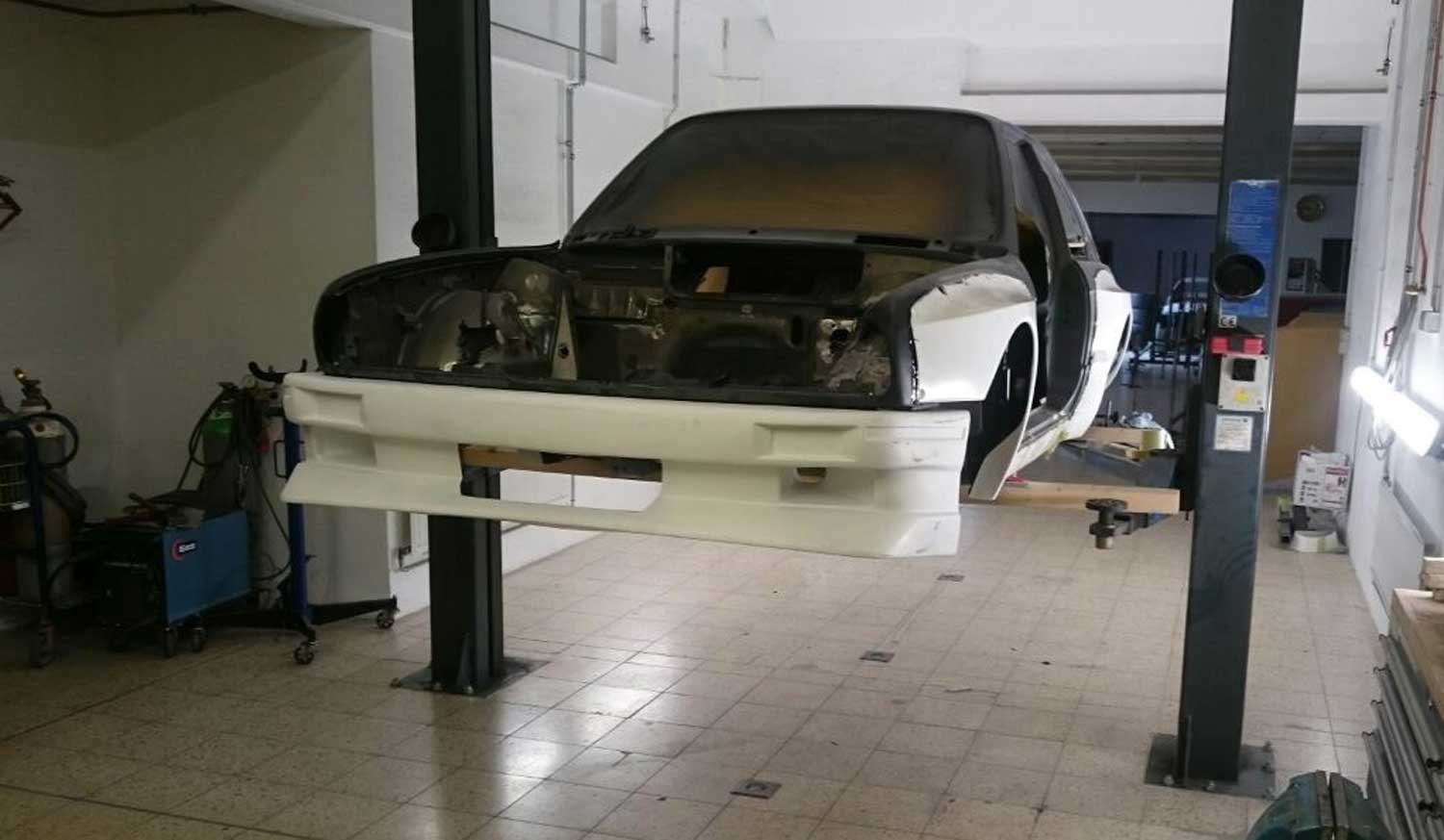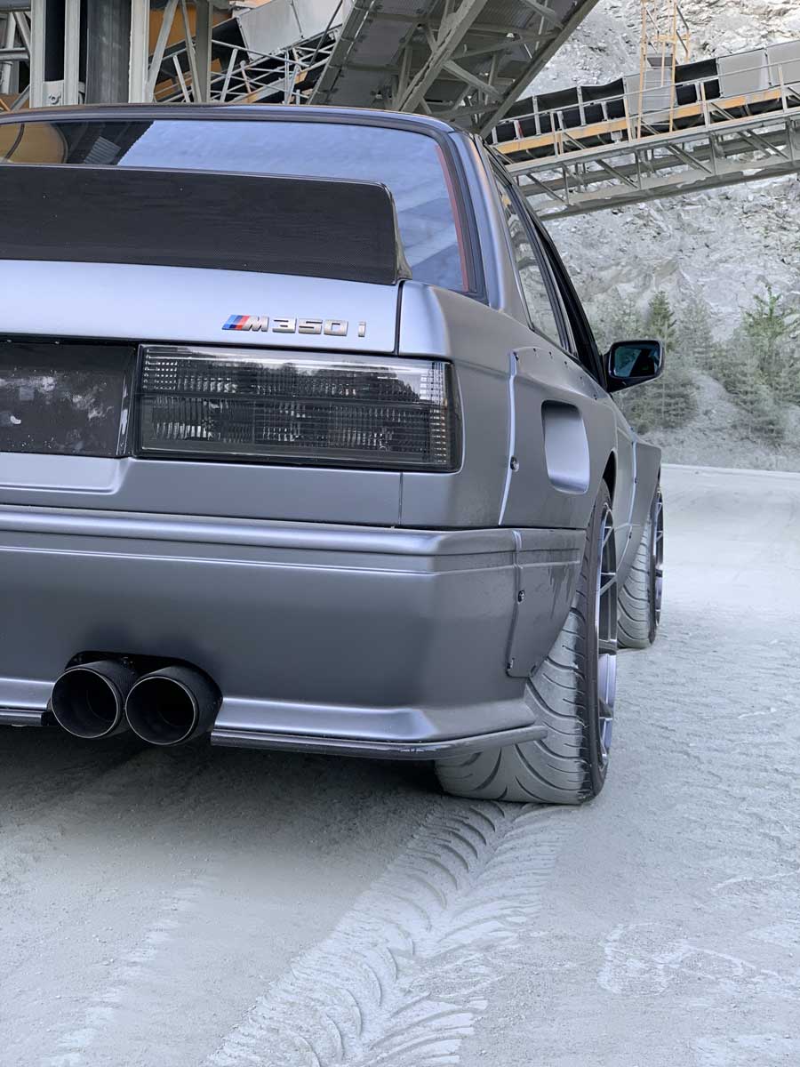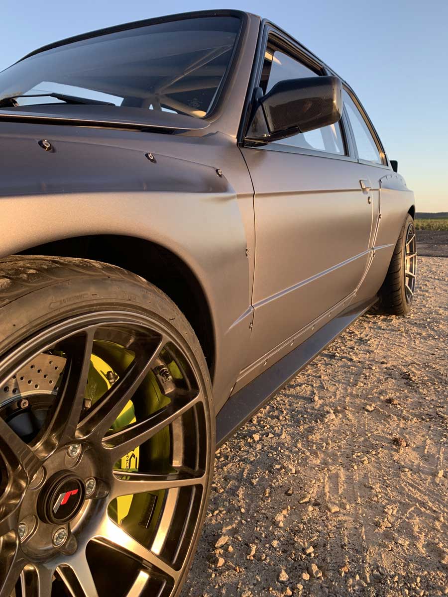 | Bodykit | Hier haben wir ein Widebodykit verbaut. Wie auch M3 E30 EVO Stoßstangen, diese wurden dann auch noch von uns auf die Verbreiterungen abgeändert, wie auch in der höhe angepasst. Die Carbon Seitenschweller wie auch die umlaufenden Carbon Spoiler Lippen haben wir extra für das Fahrzeug angepasst. Ein Carbondach wurde von uns ebenfalls für das Fahrzeug angefertigt. |
