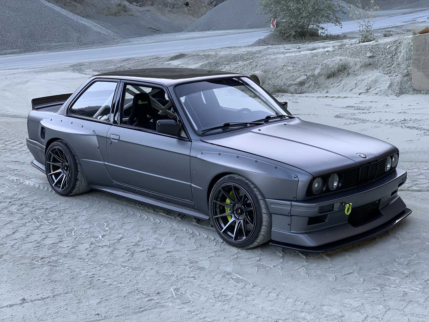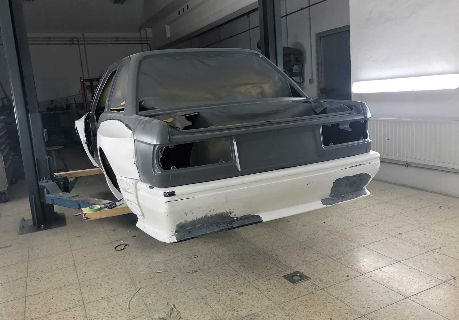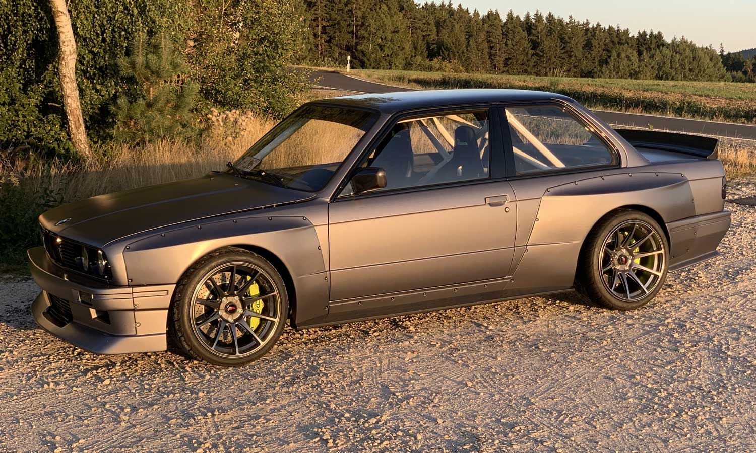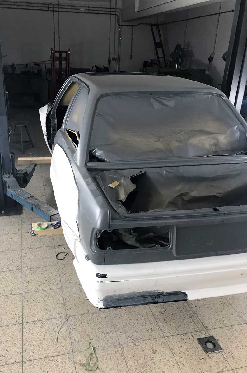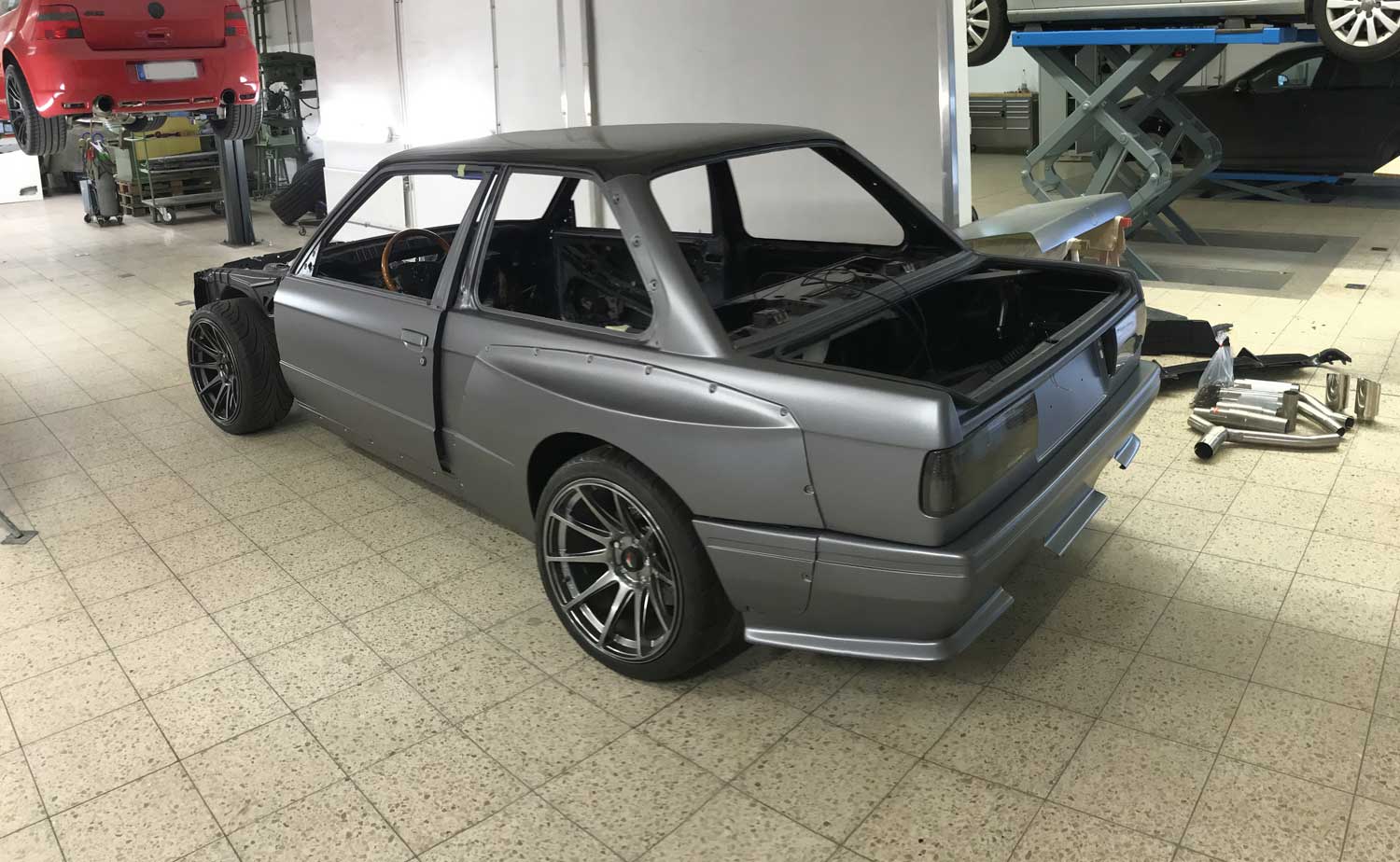 | Bodykit | Hier haben wir ein Widebodykit verbaut. Wie auch M3 E30 EVO Stoßstangen, diese wurden dann auch noch von uns auf die Verbreiterungen abgeändert, wie auch in der höhe angepasst. Die Carbon Seitenschweller wie auch die umlaufenden Carbon Spoiler Lippen haben wir extra für das Fahrzeug angepasst. Ein Carbondach wurde von uns ebenfalls für das Fahrzeug angefertigt. |