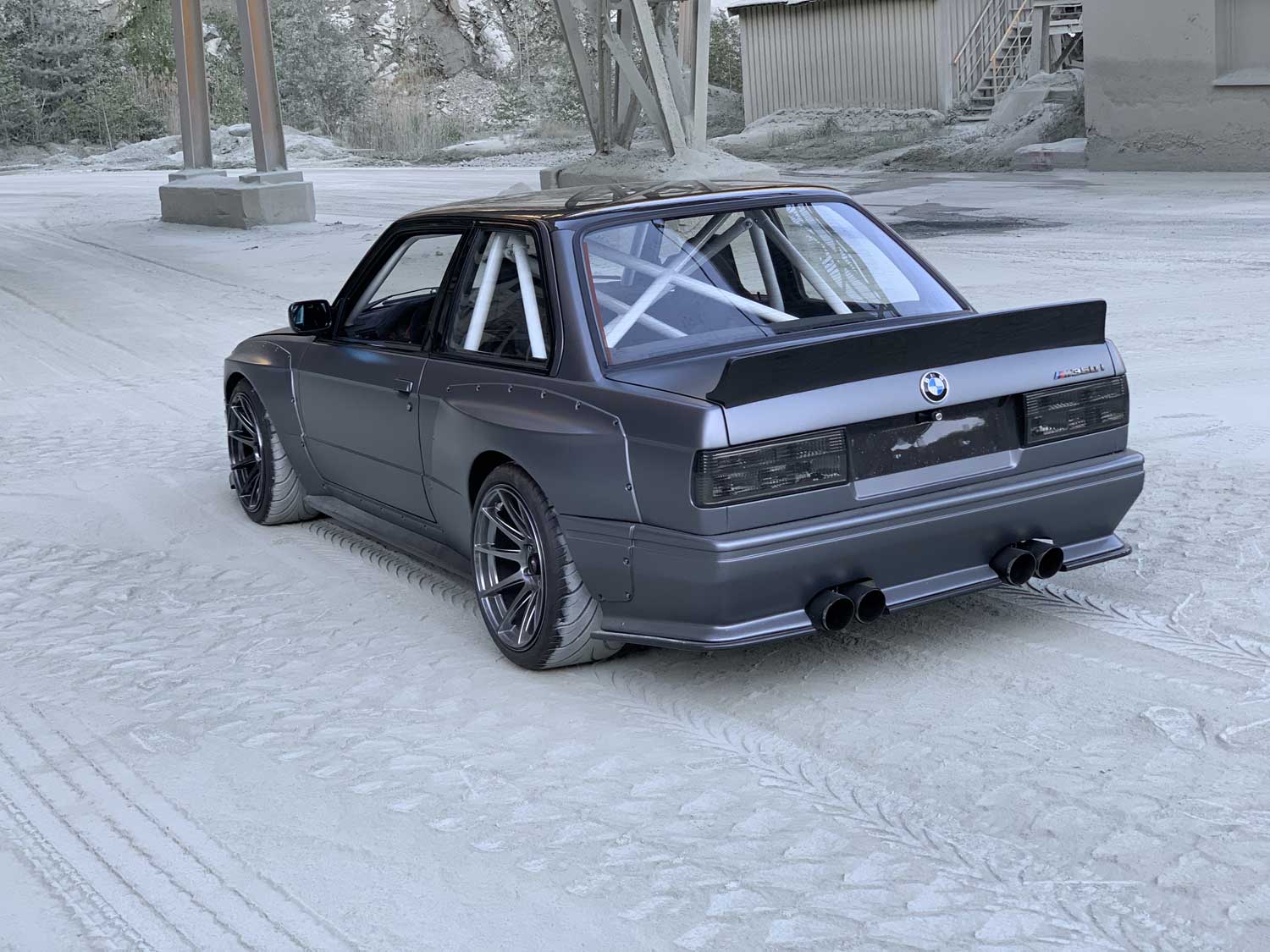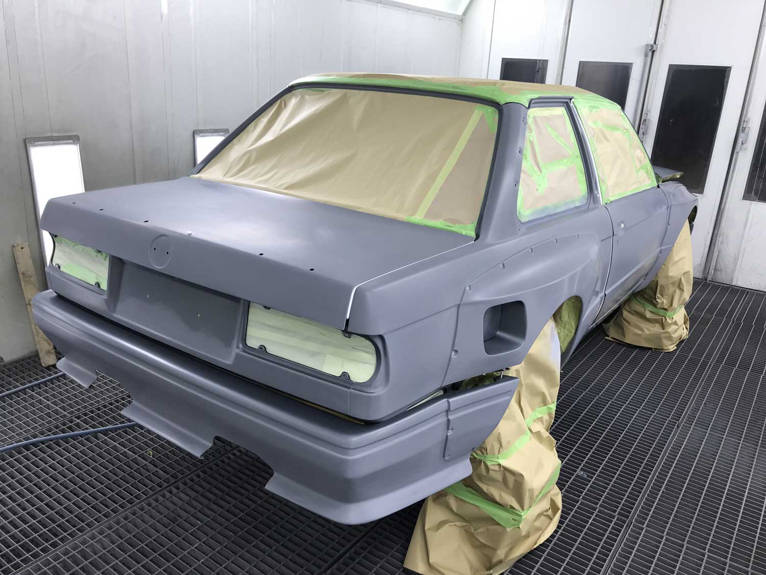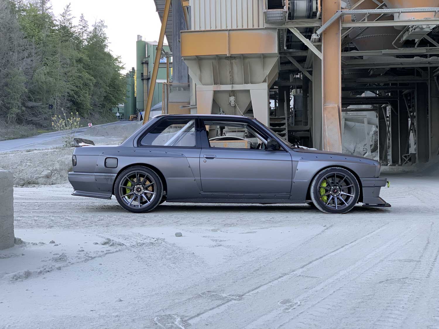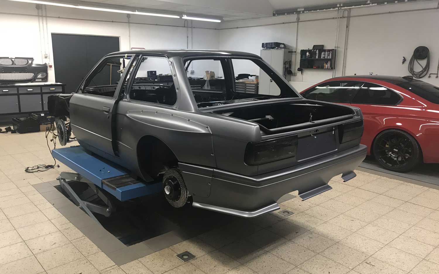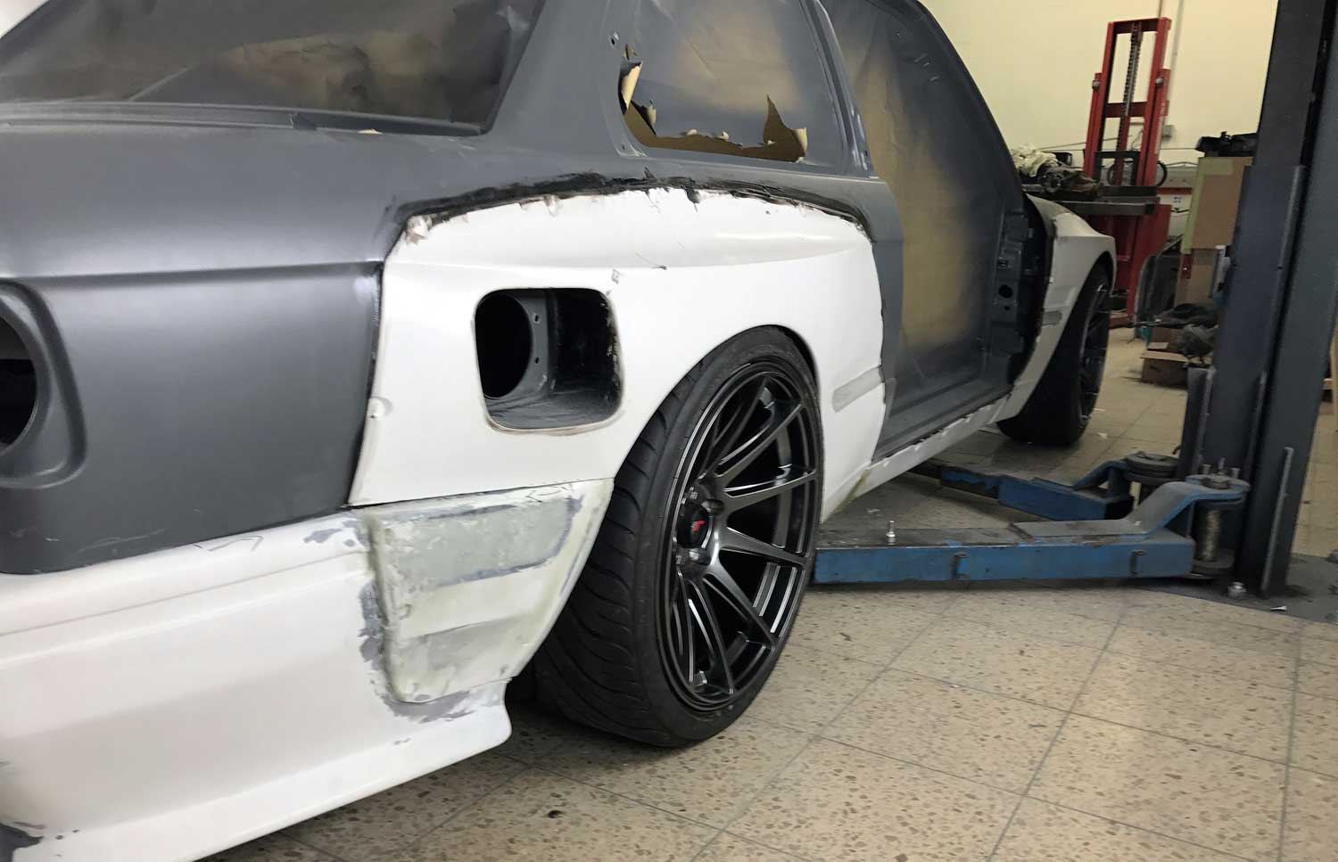 | Bodykit | Hier haben wir ein Widebodykit verbaut. Wie auch M3 E30 EVO Stoßstangen, diese wurden dann auch noch von uns auf die Verbreiterungen abgeändert, wie auch in der höhe angepasst. Die Carbon Seitenschweller wie auch die umlaufenden Carbon Spoiler Lippen haben wir extra für das Fahrzeug angepasst. Ein Carbondach wurde von uns ebenfalls für das Fahrzeug angefertigt. |