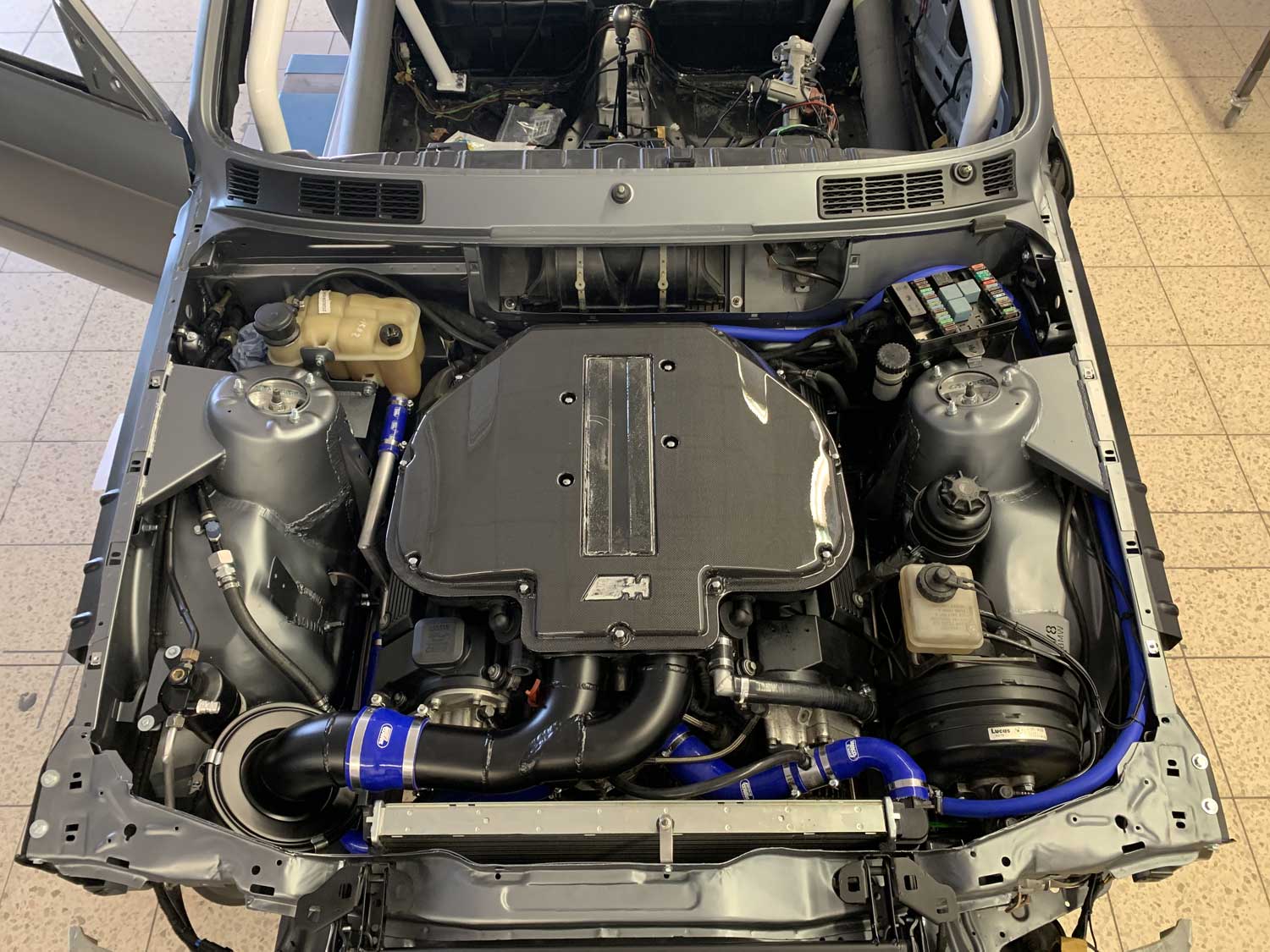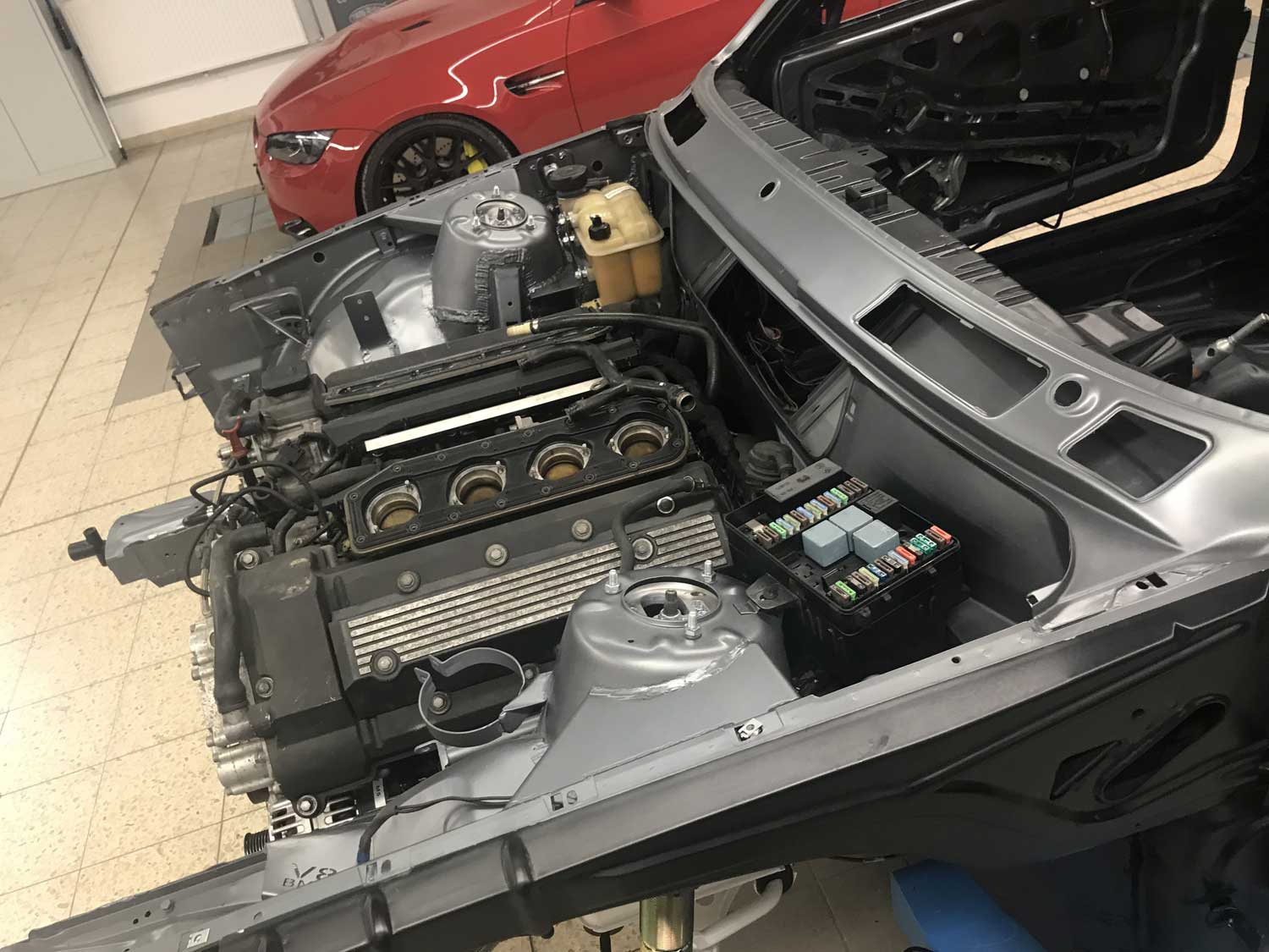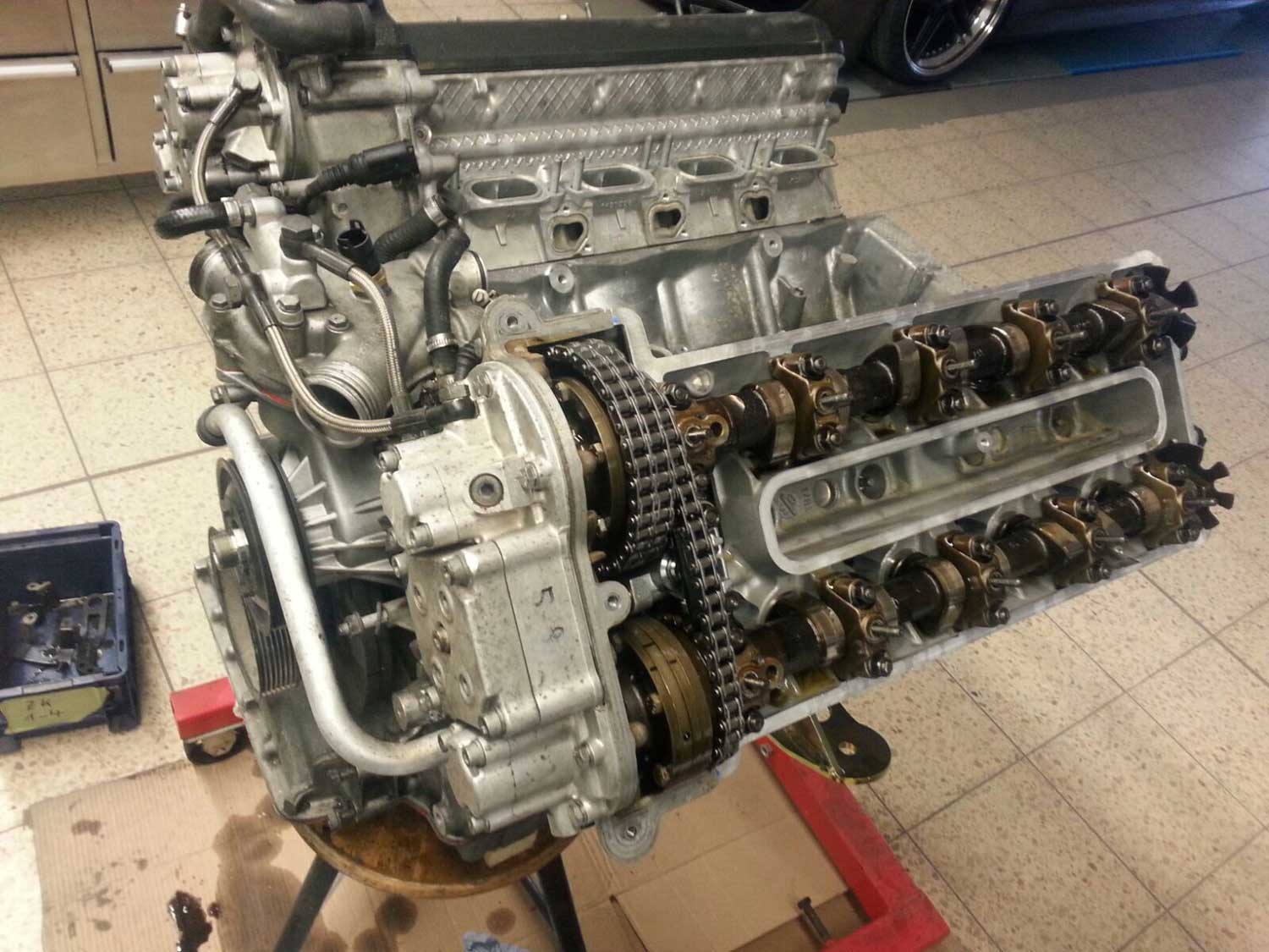 | Motor | Hier haben wir ein S62B50 V8 aus dem BMW E39 M5 verbaut. Der Motor wurde von uns komplett zerlegt und überholt. Alle Dichtungen wurden ersetzt. Die Zylindeköpfe wurden geplant. Nachdem die Zylinderlaufbahnen leichte riefen aufwiesen wurden die Zylinder Bohrungen auf das nächste Übermaß aufgebohrt und gehont. Dann wurden Übermaßkolben verbaut. Der Motor wird aktuell auf mit einem Kompressorsystem umgerüstet |