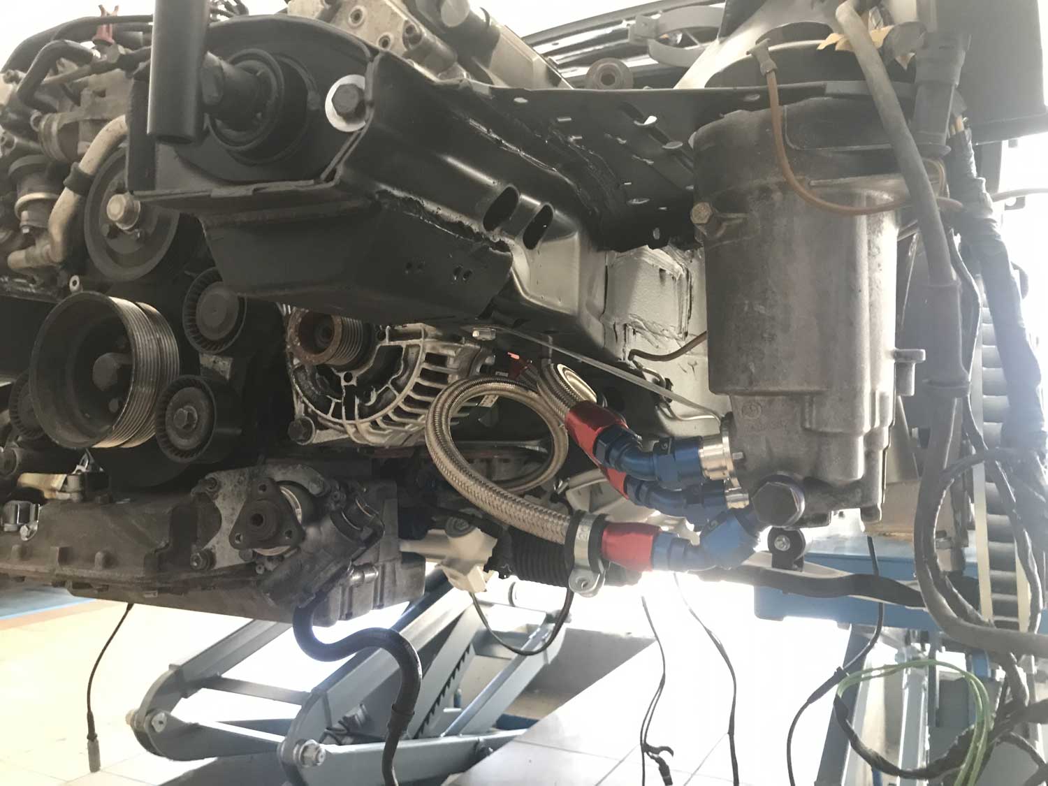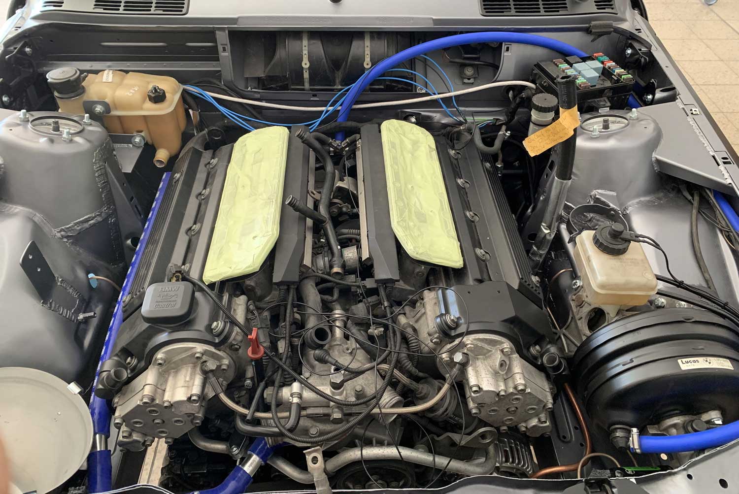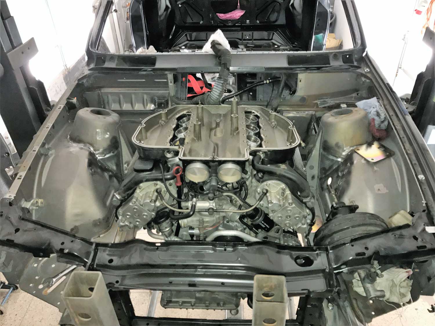 | Motor | Hier haben wir ein S62B50 V8 aus dem BMW E39 M5 verbaut. Der Motor wurde von uns komplett zerlegt und überholt. Alle Dichtungen wurden ersetzt. Die Zylindeköpfe wurden geplant. Nachdem die Zylinderlaufbahnen leichte riefen aufwiesen wurden die Zylinder Bohrungen auf das nächste Übermaß aufgebohrt und gehont. Dann wurden Übermaßkolben verbaut. Der Motor wird aktuell auf mit einem Kompressorsystem umgerüstet |