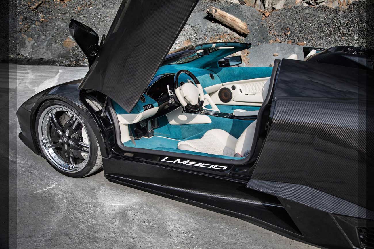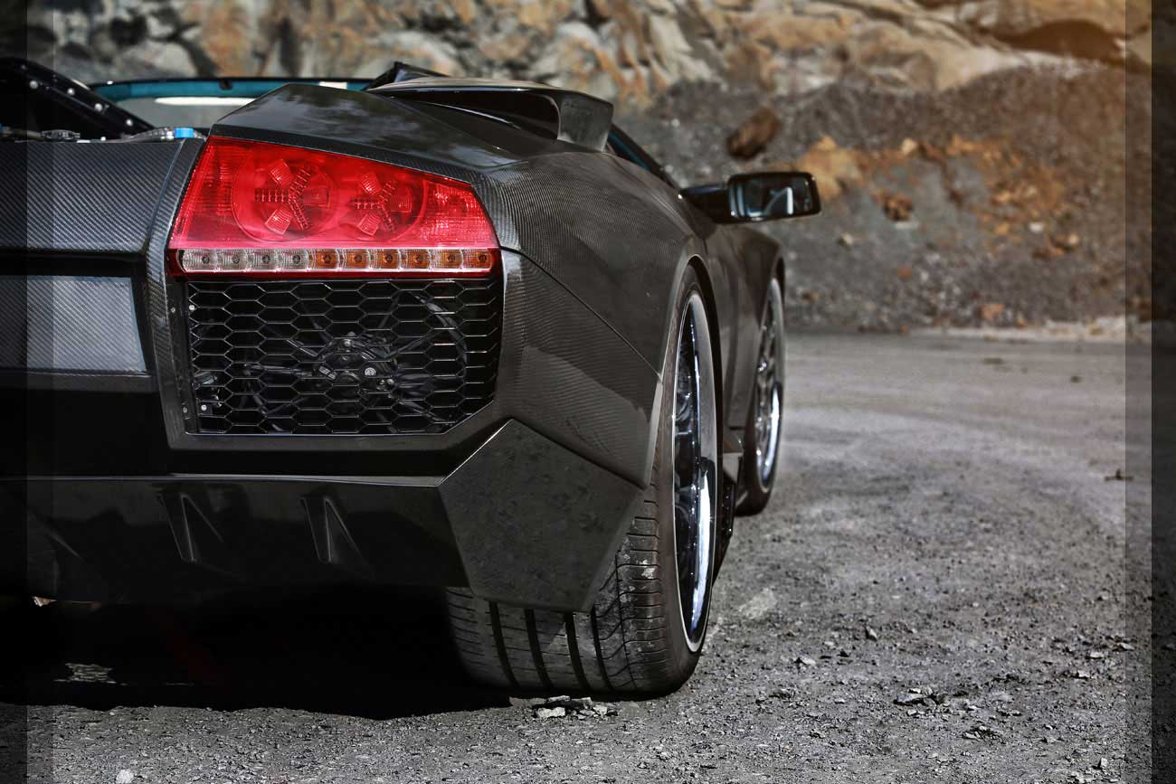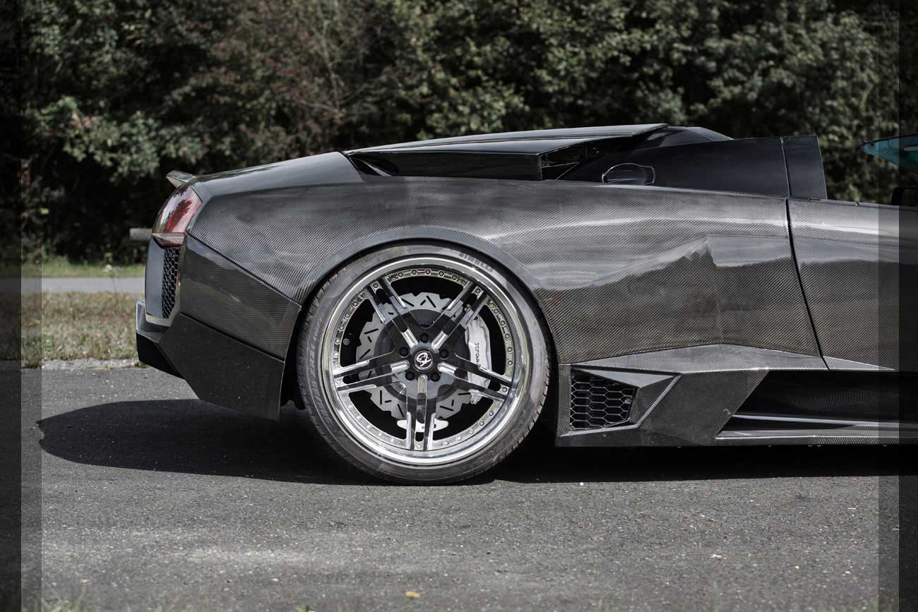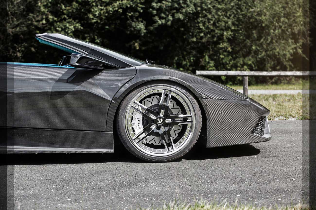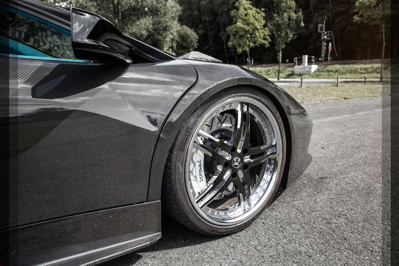 | Radsatz | Der speziell für unseren LM900 angefertigte Radsatz. Die Felgen sind CNC gefräst und 3-teilig. Vorderachse : 10,0x20,0 mit 275/30-20 Hinterachse : 13,5x21,0 mit 355/25-21 und enormen 13 cm Aussenbett Die Radläufe des Bodykits wurde exakt auf das Außenmaß der neuen Räder abgestimmt. |